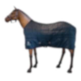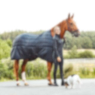 Dubbel doorgestikte staldeken. 200g polyester vulling. 100% zachte polyester voering. 100% polyester 210D buitenstof. Waterafstotend. Ademend. Machinewasbaar. Twee voorsluitingen met gespen. Zachte fleecekraag aan de bovenkant van de hals. Borduursel aan de voorzijde.