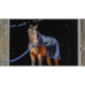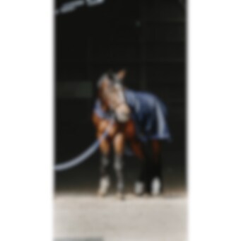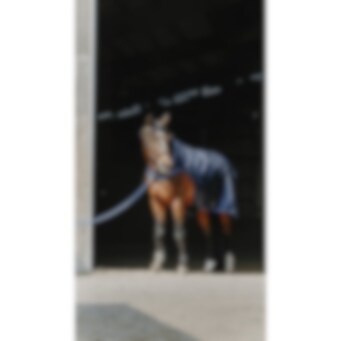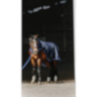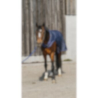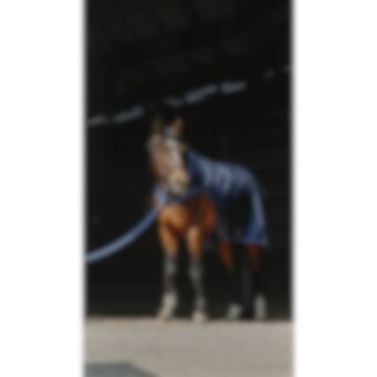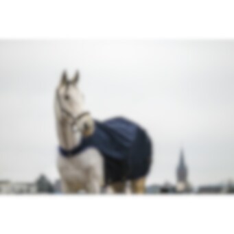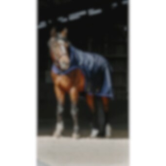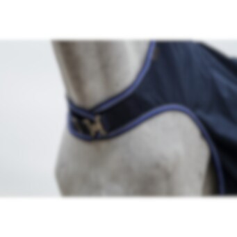 Manta de paseo azul marino repelente al agua con tejido ripstop de 1200D 3000/3000 y forro polar negro. Equipada con cinchuelos cruzados bajos elásticos y protección para la cruz en borreguillo sintético, con correas para los muslos montadas en anillas. Logo redondo de EQUITHEME en la parte trasera de la manta. Cierre delantero macho/hembra con velcro.
