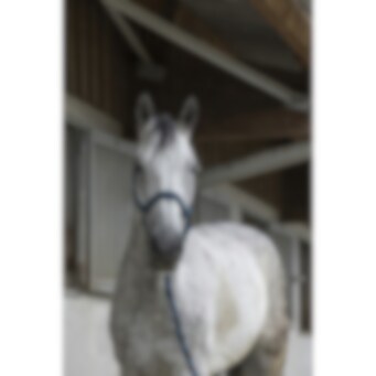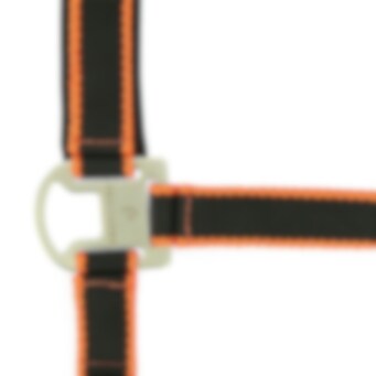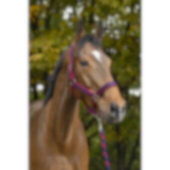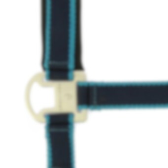 Conjunto cabezada de cuadra + ramal. Cabezada de cuadra de nylon doble espesor con muserola y testera ajustables forradas de neopreno. Apertura rápida del ahogadero con mosquetón. Hebillaje de metal satinado. Combinada con su ramal de amarre de 2,30 m.