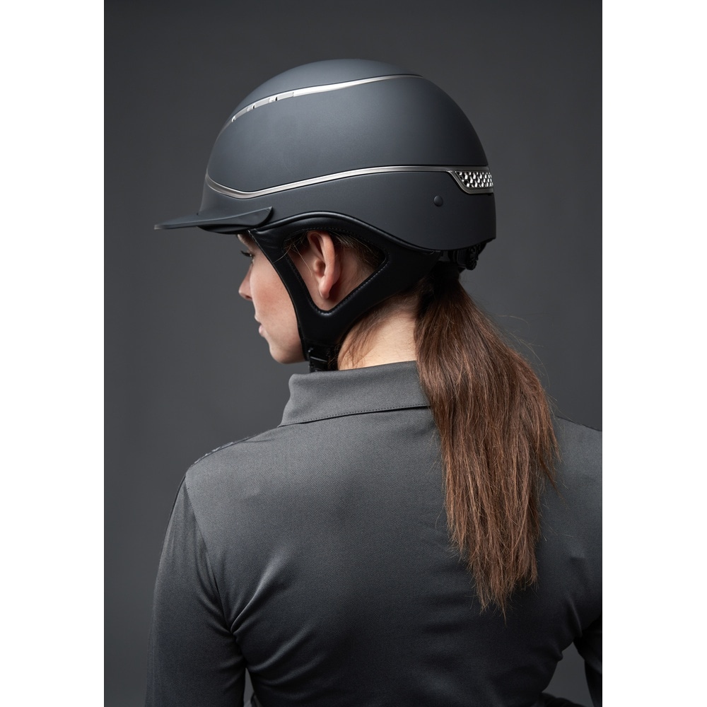 "The One K Xtreme Ridehjelm is designed for riders seeking comfort and versatility. This helmet features a larger brim for enhanced protection and a sleek black matte finish with chrome details.