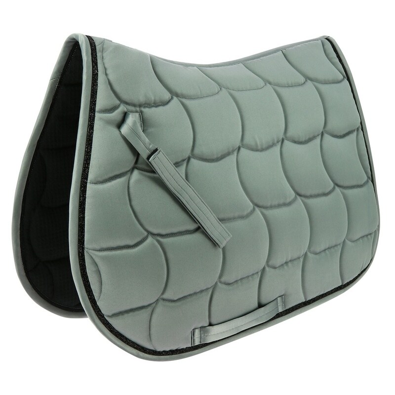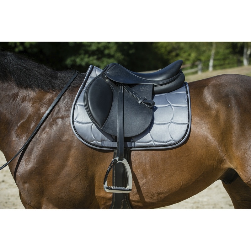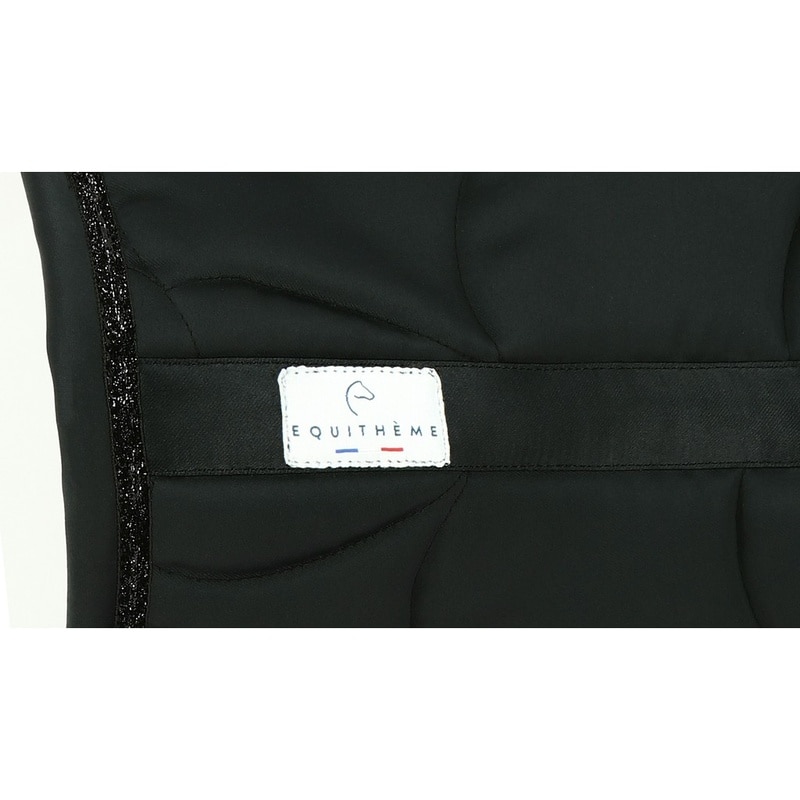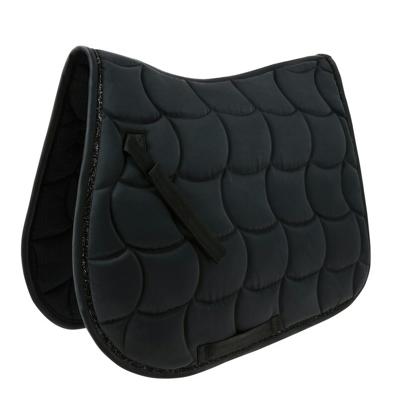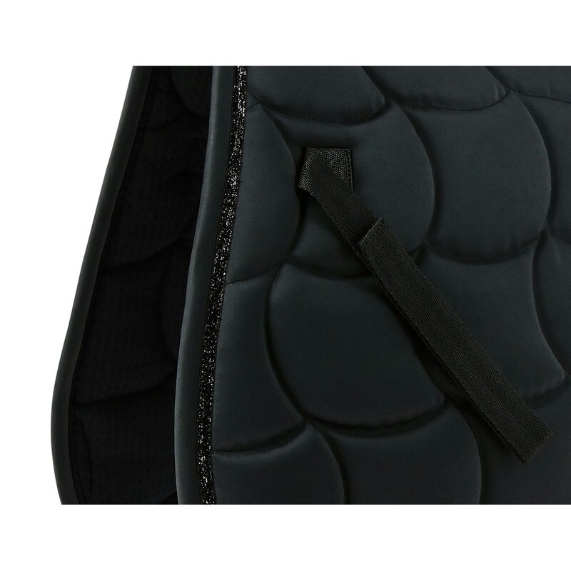 Tapis de selle en polyester satiné brillant, matelassé de polyfill 200 g/m² et 10 mm de mousse avec doublure nid d'abeille en coton. Pattes d'attache auto-agrippantes et passage de sangle. Décoré d'une bande décorative en glitter noir.