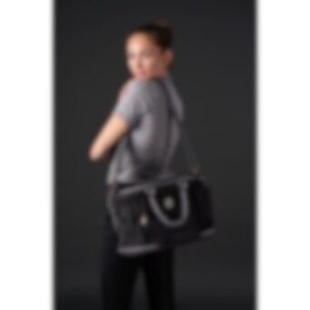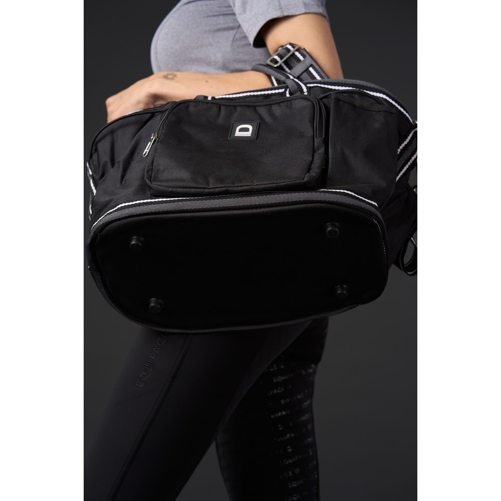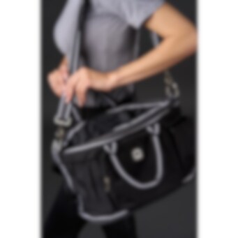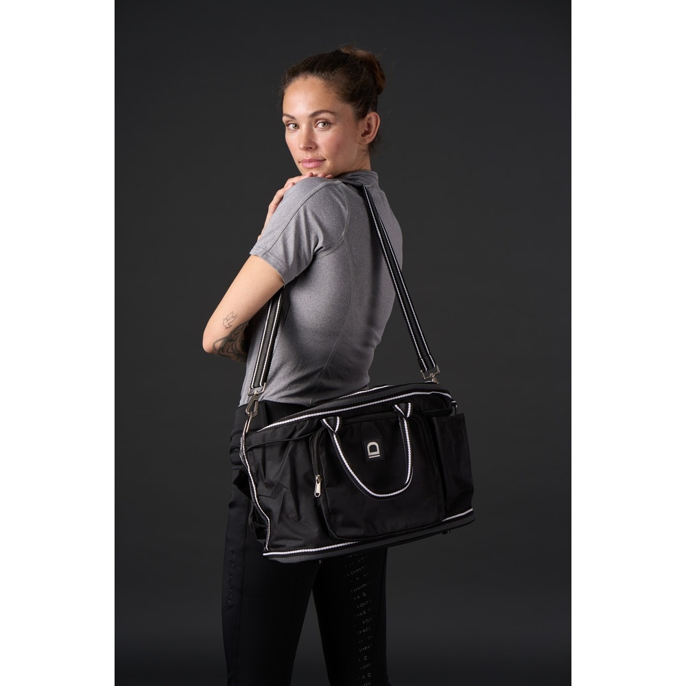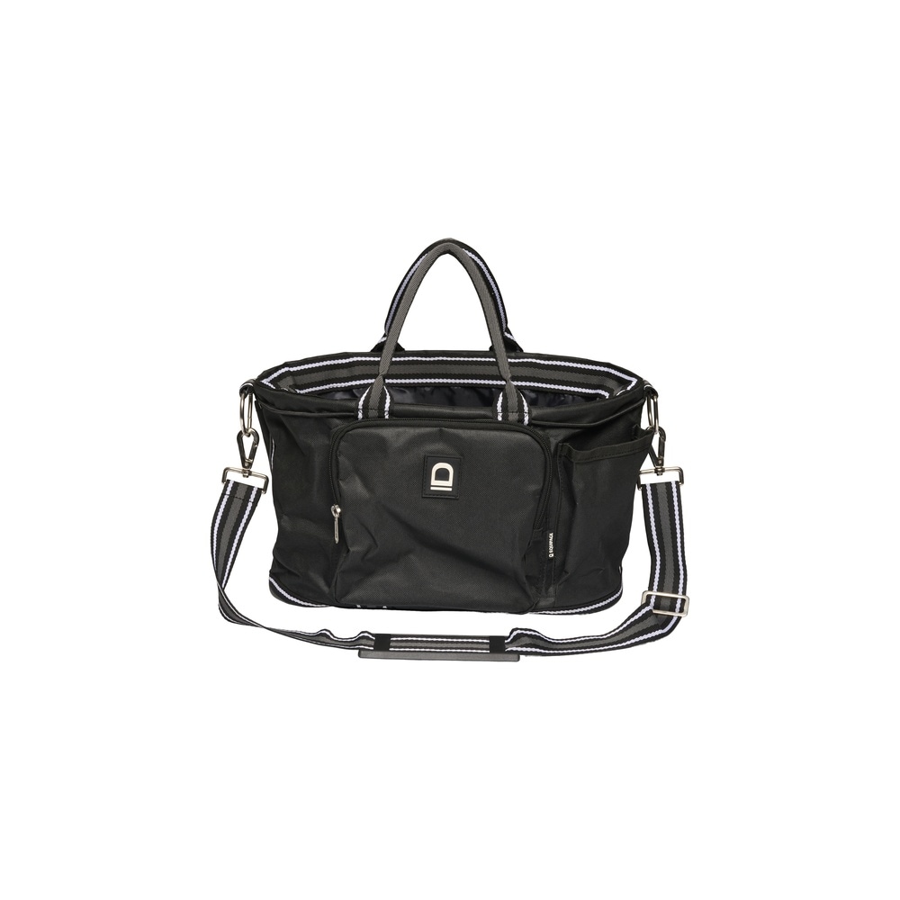Le sac de pansage Equipage Darcy est conçu pour les cavaliers qui ont besoin d'une solution fiable et organisée pour leurs outils de pansage. Idéal pour un usage à la maison comme en concours, ce sac allie fonctionnalité et style.• Le sac de pansage comporte 6 poches extérieures, dont une à fermeture éclair pour un rangement sécurisé. • Le grand compartiment principal comprend une poche intérieure zippée pour une organisation supplémentaire. • Fabriqué en tissu polyester doux noir, il est durable et facile à nettoyer. • Équipé de poignées en sangle rayée et d'une bandoulière réglable pour un transport confortable. • Ornées d'un badge en caoutchouc avec un logo étrier pour une touche d'élégance équestre. • Dimensions approximatives : Hauteur 26 cm, Fond Ø 35 cm.