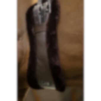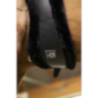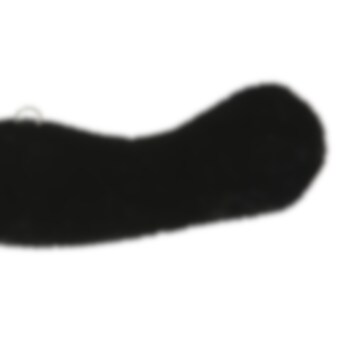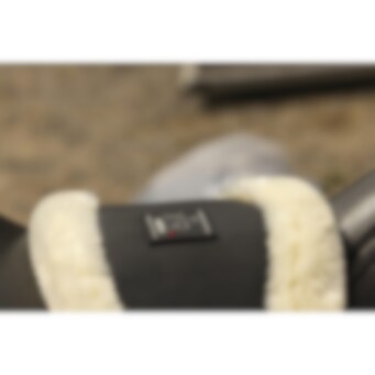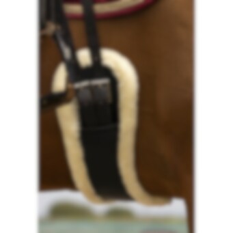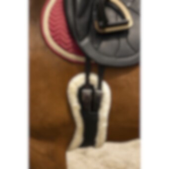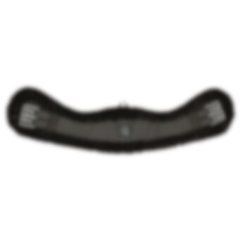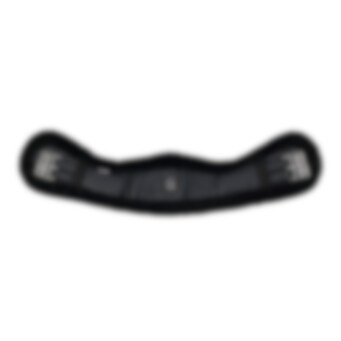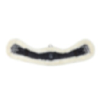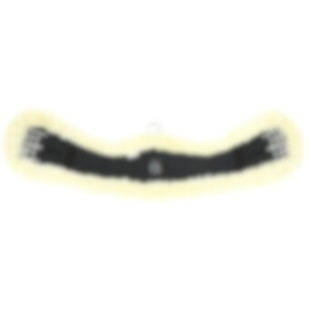 Short synthetic girth in leather-like polyurethane lined with high density synthetic sheepskin. Stainless steel roller buckles on double elastic ends on both sides. Features a central ring.