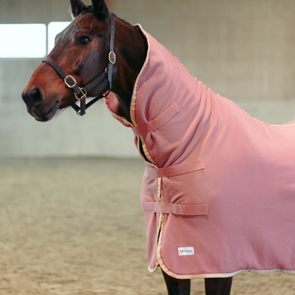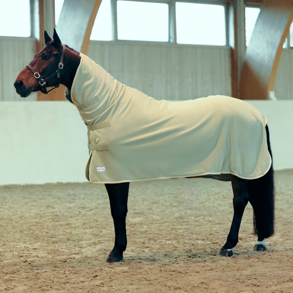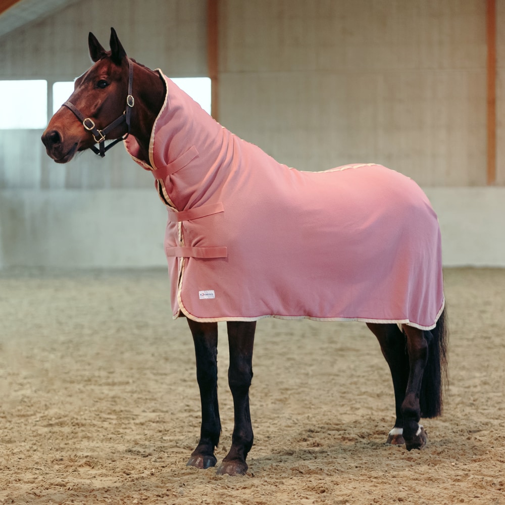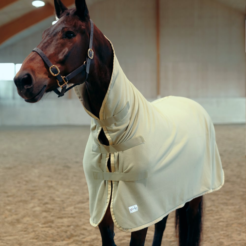 Coperta in pile per cavalli, con un design a collo alto progettato per coprire completamente l’area del collo. Ideale da utilizzare, ad esempio, durante l’asciugatura del cavallo, o in inverno sotto una coperta pesante per fornire sufficiente calore durante il trasporto. La coperta è dotata di tre attacchi anteriori con chiusura a strappo sul petto e una cinghia sotto la coda.