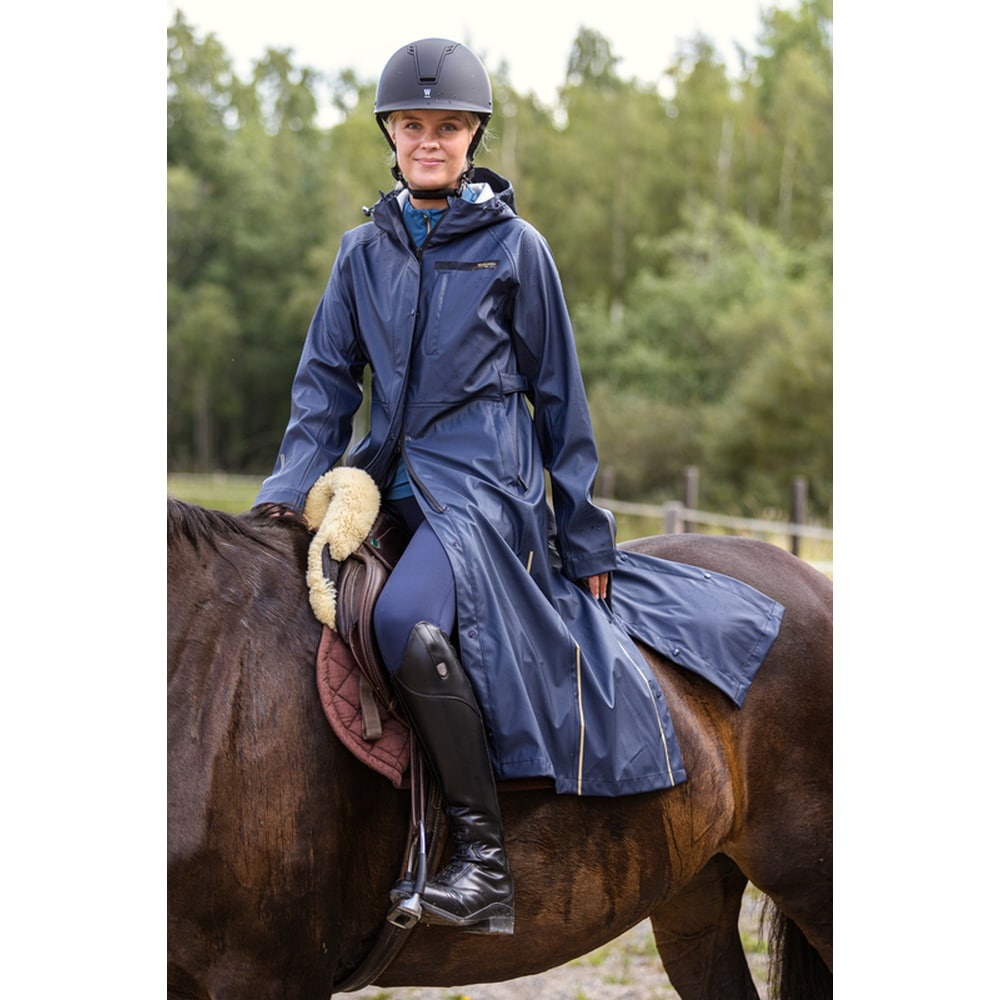 Wahlsten Calaverite Regnjakke er en elegant, ekstra lang regnjakke designet for ryttere som setter pris på både stil og funksjonalitet. Med sin sofistikerte silhuett og gjennomtenkte detaljer, sørger denne jakken for at du holder deg tørr og ser uanstrengt chic ut.• Laget av 100% polyuretan for utmerket vannbestandighet• Har sveisede sømmer for ekstra holdbarhet og beskyttelse• Glidelåslommer på bryst og hovedlomme gir sikker oppbevaring• Justerbar midje gir en personlig passform• Elastiske ermeender gir komfort og en tettsittende passform• Tre splitter bak for bedre bevegelse når du rir• Innvendige benstropper holder jakken på plass over låreneSlik bruker du den: Perfekt for ridning i våte forhold, kan denne regnjakken brukes over din favoritt ridebekledning for et raffinert utseende.Lengde midt bak: 120 cm (i størrelse 38/M).
