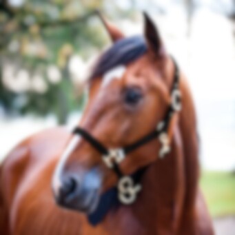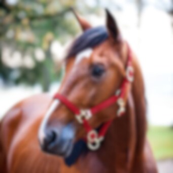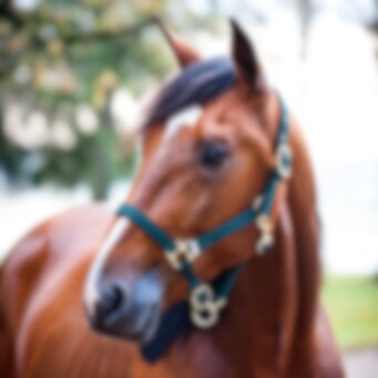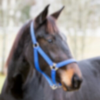 Nylongrime med justering på hakereimen. Karabinkrok ved kjeven for enkel åpning. Nese- og nakkereimer fôret med semsket kunstskinn.