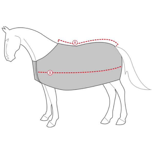 Alle mål i tabellen er målt på hestens kropp, ikke på dekkenet. For å få EU-størrelsen på dekkenet, måler du hestens rygg fra manken til haleroten i centimeter (A). Alternativt kan du måle størrelsen i UK/US dekkenmål i inches eller feet og inches, ved å måle fra hestens bog til bakparten (B).